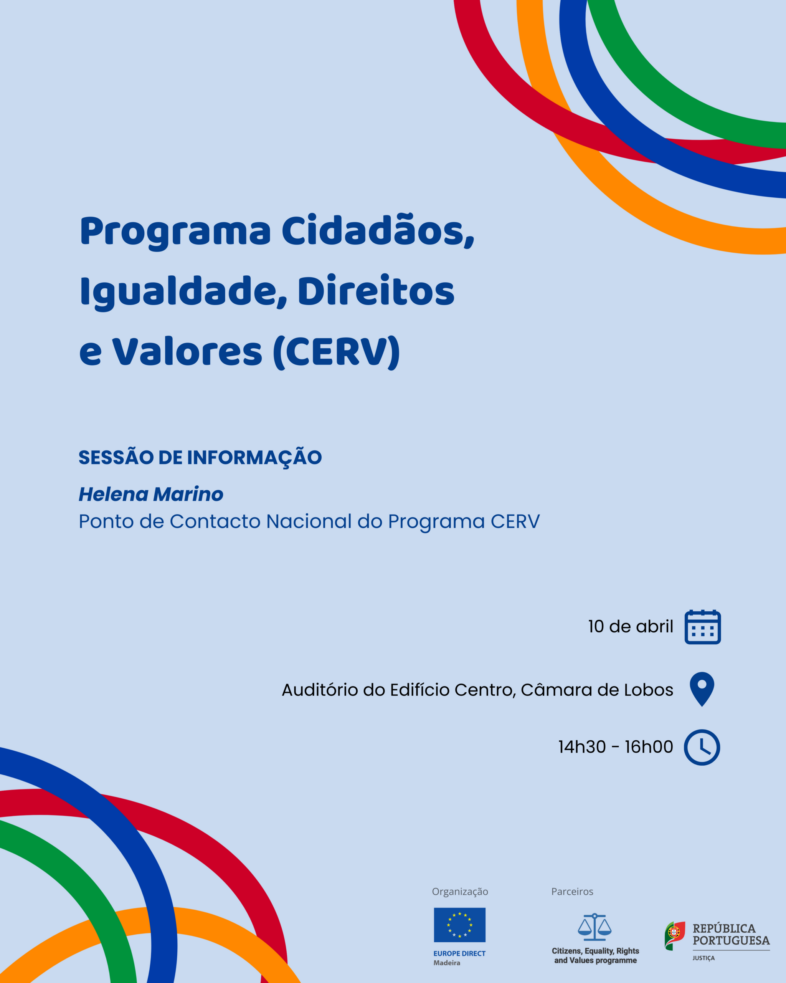 Decorre no próximo dia 10 de abril, entre as 14h30 e as 16h00, no Auditório do Edifício Centro, em Câmara de Lobos, uma sessão de informação sobre o programa CERV – Cidadãos, Igualdade, Direitos e Valores.